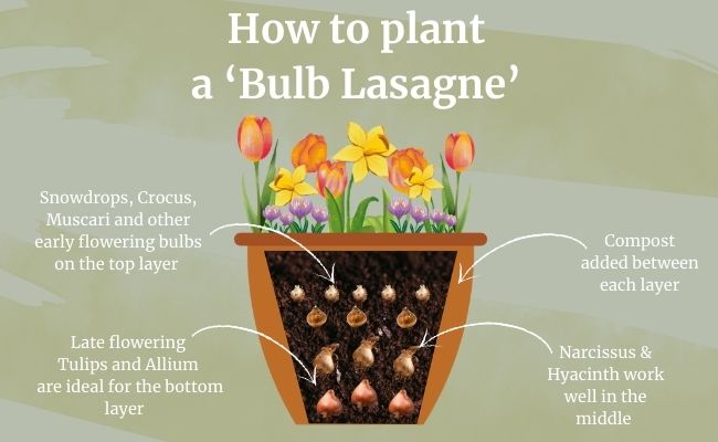 - Bulb lasagne – For an extra-long display in pots, try layering bulbs in what’s known as a “bulb lasagne”. Larger, later-flowering bulbs such as tulips go at the bottom, daffodils in the middle, and smaller, earlier bulbs like crocuses at the top. They’ll flower in sequence, giving you weeks of colour from just one pot. (See our photo for inspiration!)